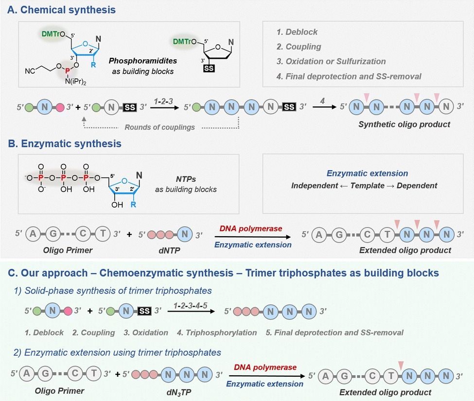 A common drawback of both chemical and enzymatic synthesis methods is that we cannot easily modify or tag the DNA sequences. Tagging or modifying bases is a useful tool for storing information in DNA. But doing so might affect its coupling efficiency to the adjacent base, rendering it useless. This begs the question: is there a better method of DNA synthesis that can leverage the benefits of existing methods while mitigating their limitations?