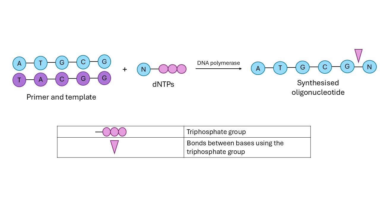 Enzymatic synthesis uses a template for the nucleotides to follow. Nucleotides bases have complementary pairs: A to T, and G to C. The template will be complementary to our desired sequence. A sequence of bases called a primer will initiate this sequence formation. We also add free nucleotides with a triphosphate group attached to one end (they are called deoxyribonucleotide triphosphates, or dNTPs for short). Enzymes called ‘DNA polymerases’ will be used to facilitate the addition of the dNTPs at every step.