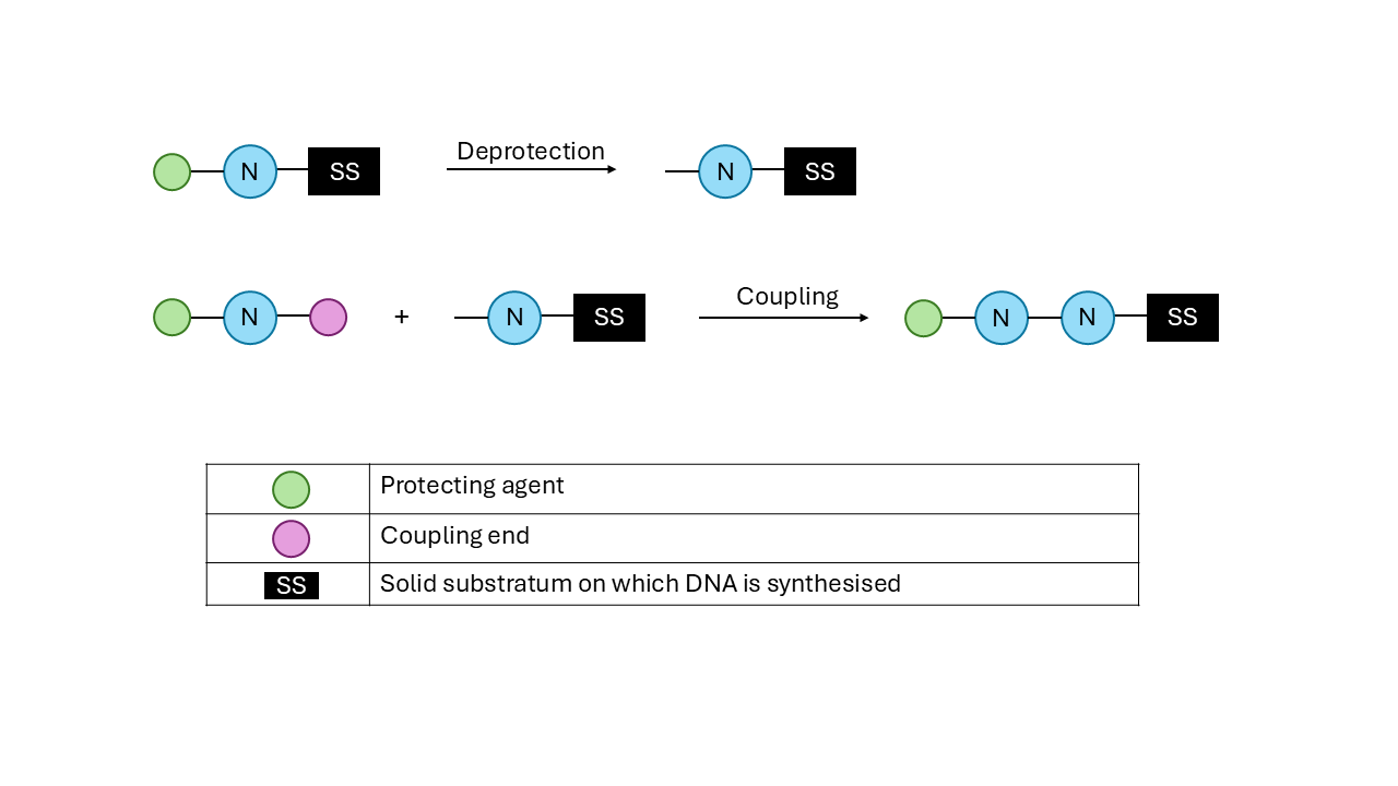 Image Description: Schematic for chemical synthesis of DNA. Figure by author.